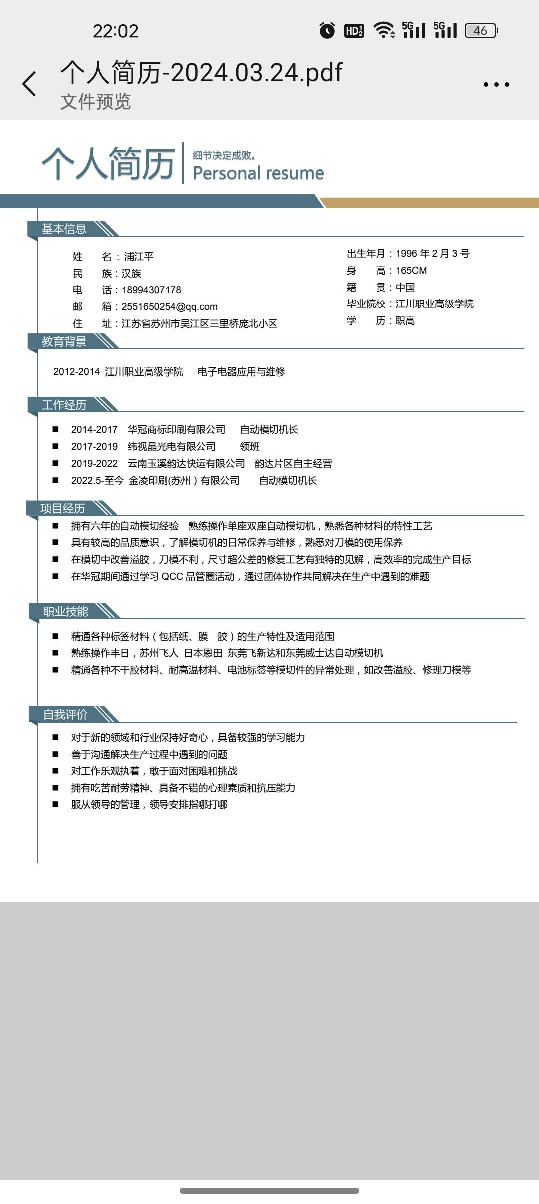 - 工作描述: 拥有7年的自动模切经验,熟练操作单座或者双座自动模切机,熟悉各种材料的特性工艺,具有较高的品质意识,了解模切机的日常保养与维修,熟悉对刀模的使用保养,在模切中对溢胶,刀模不利,尺寸超公差的修复工艺有独特的见解高效率的完成生产目标。